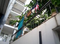 - 2-а номер «апартамент» 25кв.м. двухкомнатных 2-хместных (возможно 1-номестное размещение и дополнительное место на евро-раскладушке); в номере спальня (двуспальная или 2 односпальные кровати, TV (обычн., кабельн.), интернет Wi-Fi, индивидуальный кондиционер); кухня (мини-кухня, обеденный стол со стульями, индивидуальный кондиционер, сейф) и санузел (умывальник, туалет, душевая), терраса (общая для 2 номеров), отреставрирован.